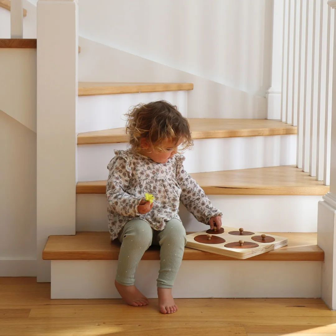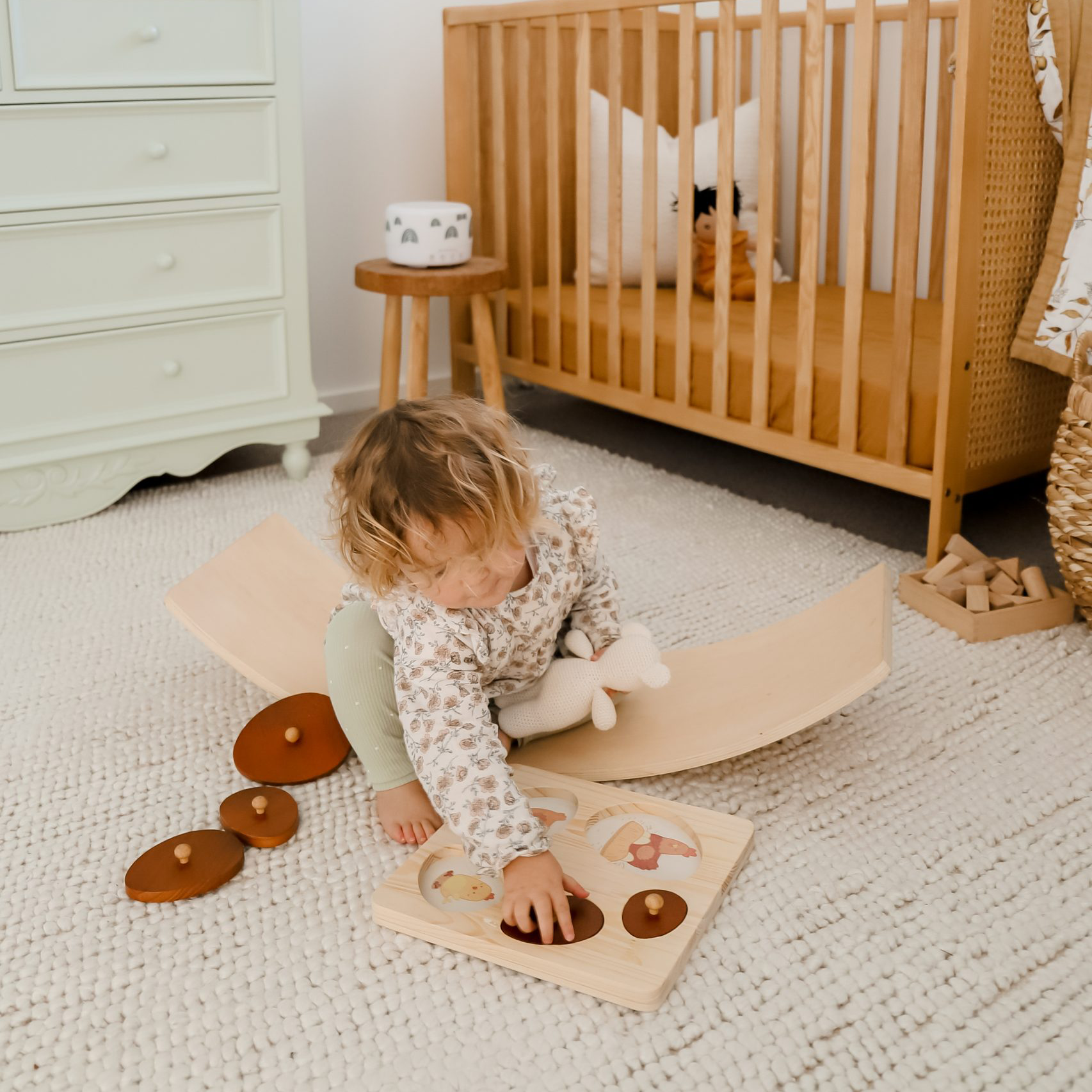 This peg puzzle not only challenges your munchkin to discriminate between the different sized eggs, but it also has an added layer of difficulty as your little one navigates the changing positioning of the egg.