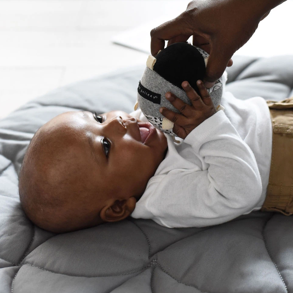 Featuring Wee Gallery's signature high-contrast hand painted graphics, it will grab baby's attention visually, while its textures and rattle provide tactile and auditory stimulation.