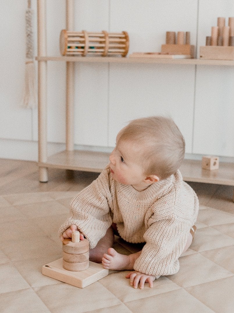The ring stacker isolates the skill of putting the rings on the dowel by keeping the shapes and colours consistent.